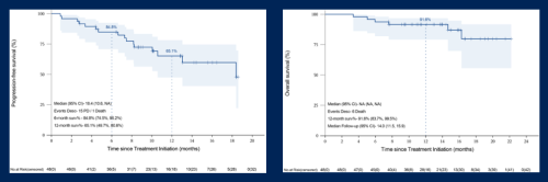 本研究中位随访时间为14个月,6个月PFS率为84.8%,12个月PFS率为65.1%,中位PFS为18.4个月。12个月OS率91.6%,中位OS未达到(图5)[1]