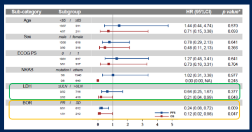 亚组分析发现,相较于基线时乳酸脱氢酶(LDH)升高的患者,基线时LDH正常的患者的OS有获益趋势;达到PR的患者有较好的PFS和OS(图6)。